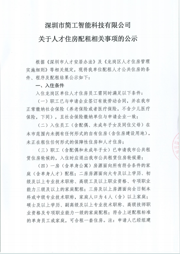 深圳市簡工智能科技有限公司關于人才住房配租相關事項的公示